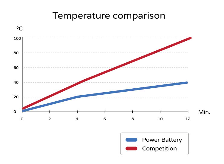 De temperatuurmetingen van de Power Battery oplossing zijn weergegeven in de figuur hiernaast. Deze waarden zijn gebaseerd op een vergelijking tussen het Power Battery “Performance” model en het best beschikbare alternatief op de markt. Beide zijn onder dezelfde omstandigheden getest.