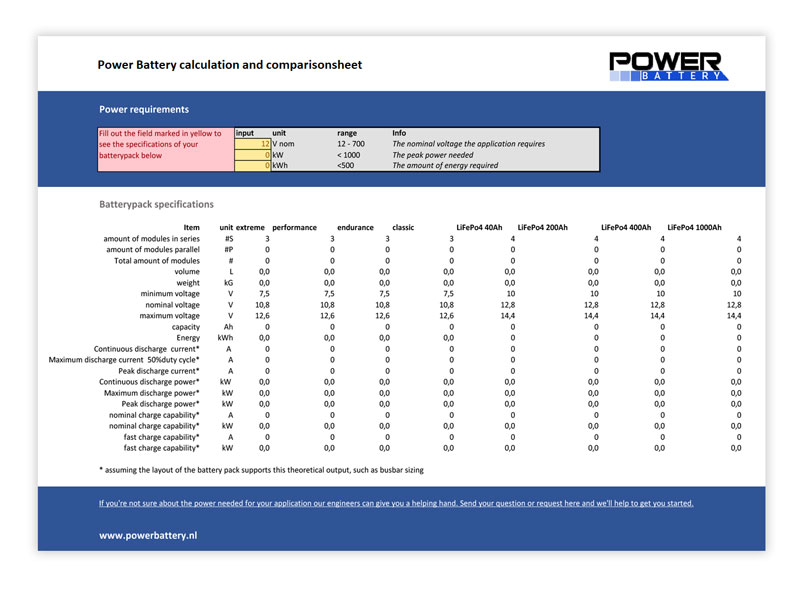 Op basis van jouw stroombehoeften genereert dit handige Excel-bestand een overzicht van de technische specificaties van jouw accupakket met Power Battery modules versus LiFePo4-accu’s.